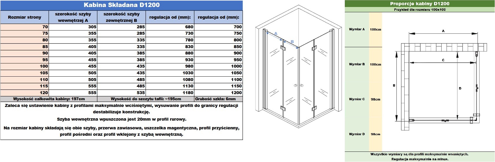 Prezentowana kabina uchylna to model D1200. Posiada ona dwa w pełni składane skrzydła, które po złożeniu całkowicie zwalniają przestrzeń dolegając idealnie do ściany. Konstrukcja profilu przyściennego sprawia, że podczas składania drzwi delikatnie unoszą się do góry. Jest to idealne rozwiązanie dla osób starszych oraz z niepełnosprawnościami. Konstrukcja umożliwia montaż zarówno na brodziku, jak i bezpośrednio na podłodze.