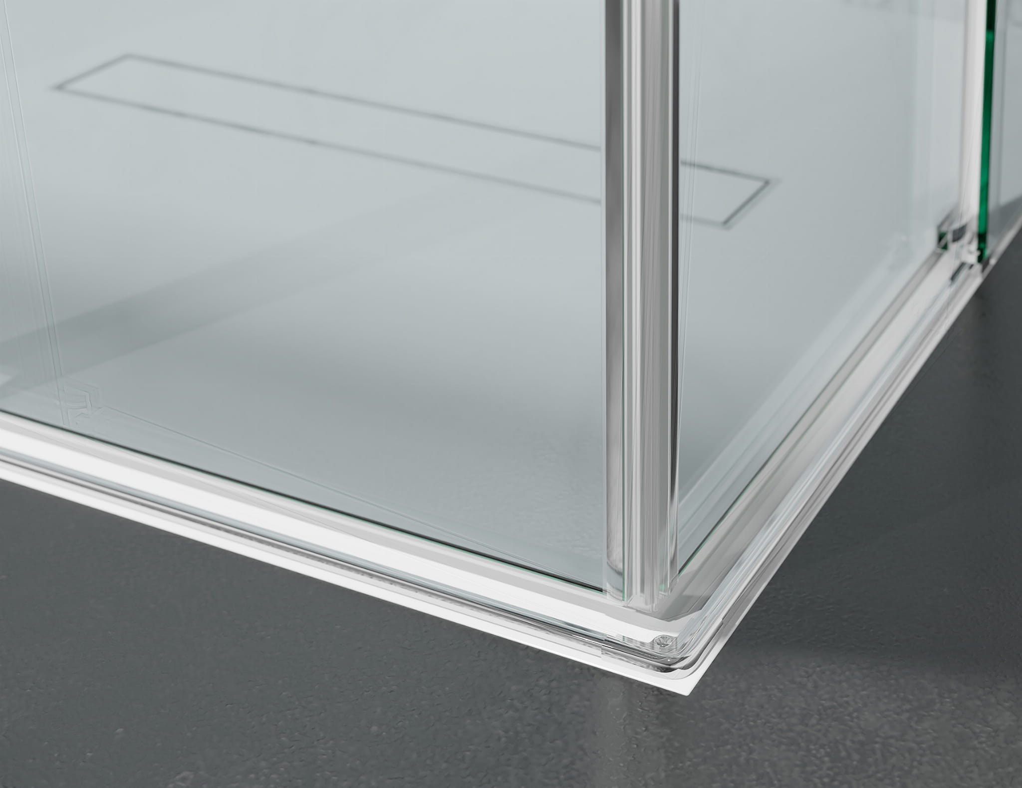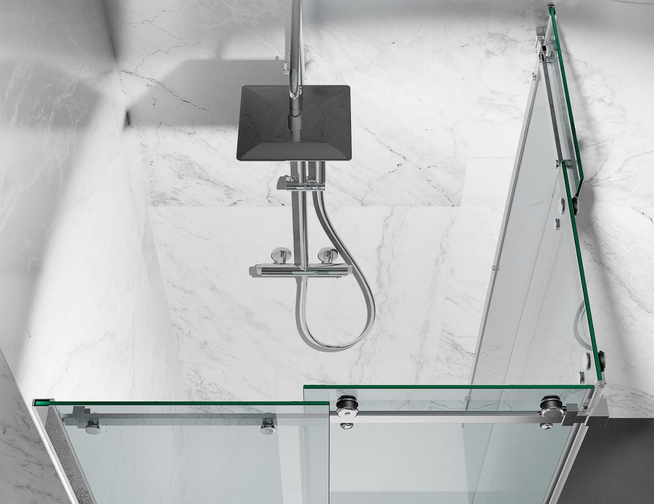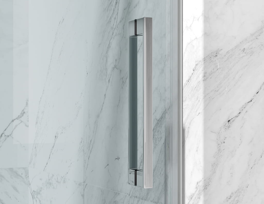 Kabina narożna z systemem podwójnych drzwi przesuwnych z zastosowaniem systemu rolek górnych. To nowatorskie na rynku polskim rozwiązanie. Pozwala uzyskać wygodny dostęp do prysznica nawet na małej przestrzeni.